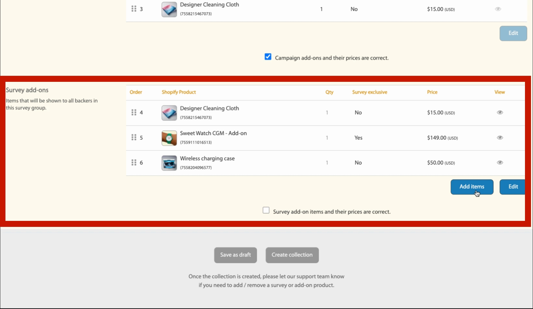 1. Collections are created on Shopify for each reward level to facilitate survey management. In the base survey items section of the collection builder, you will find the default products included in the survey for this reward level.